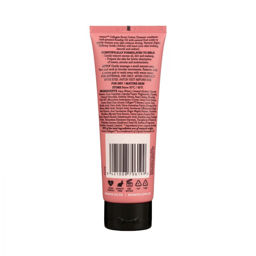 essano Collagen Boost Crème Cleanser combines cold-pressed Rosehip Oil with natural fruit acids to gently cleanse your skin without drying. Natural Alpha Hydroxy Acids (AHAs) will leave your skin looking smooth and radiant.