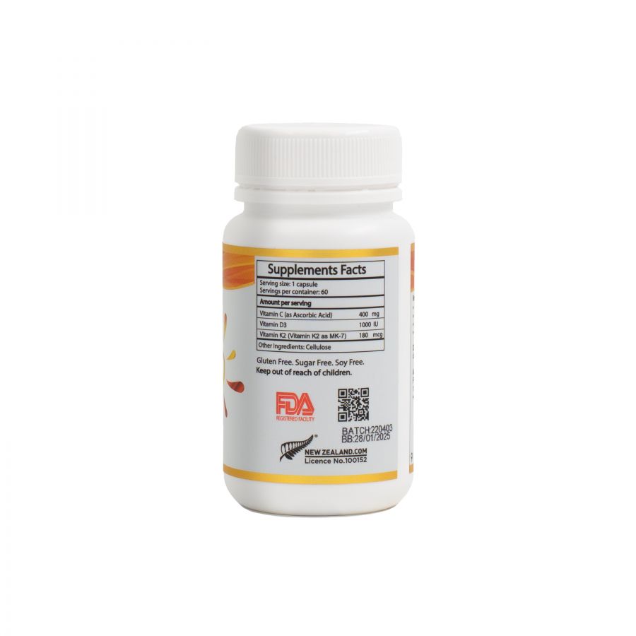 Pure Vitality Vitamin K2 with D3 and Vitamin C capsules combine three nutrients extensively researched for their contribution to supporting natural immunity, the cardiovascular system and healthy bones and teeth.