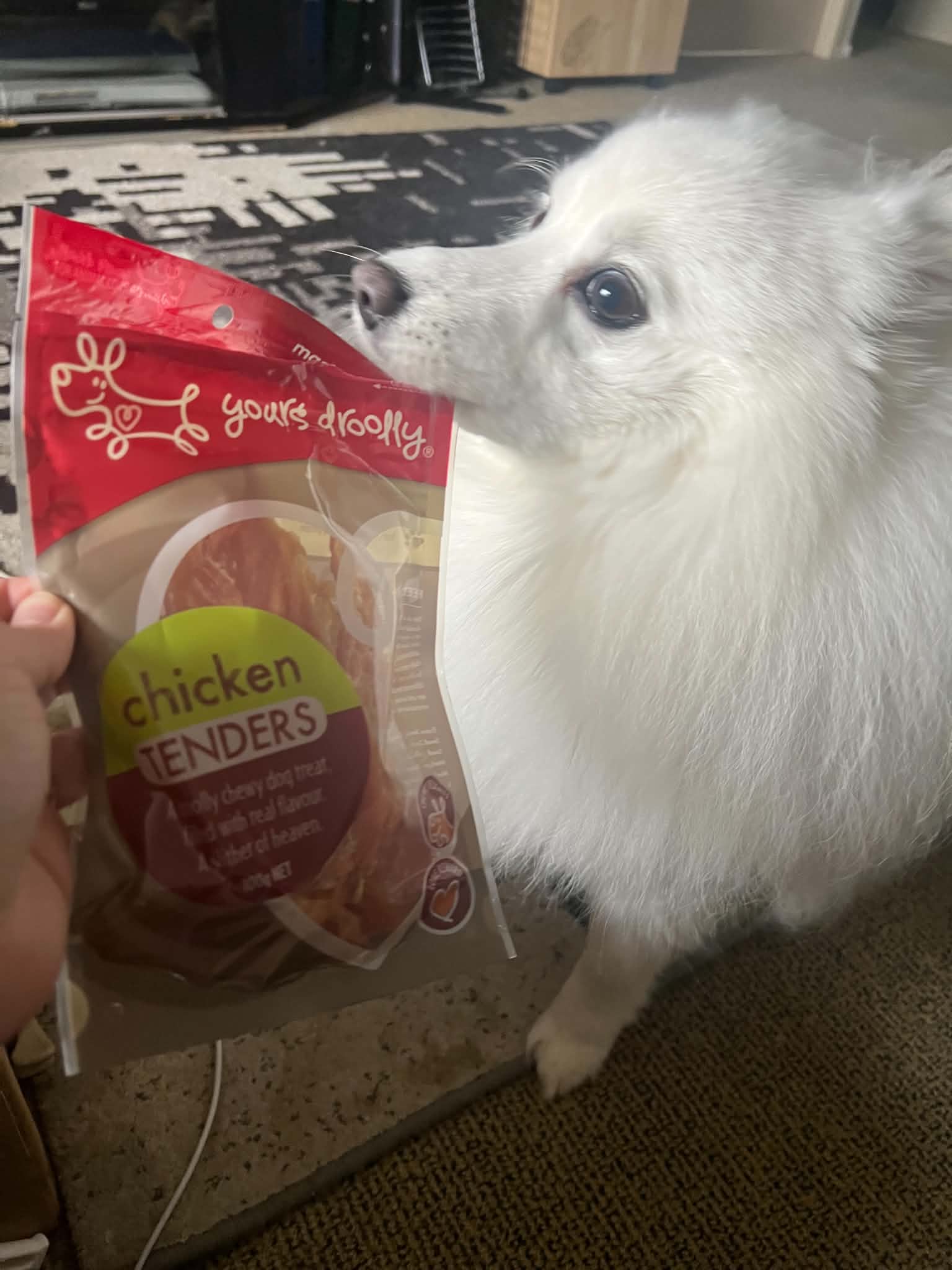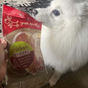 These Yours Droolly Chicken Tenders are a high protein, low calorie treat for your best friend, and perfect for rewarding or training.