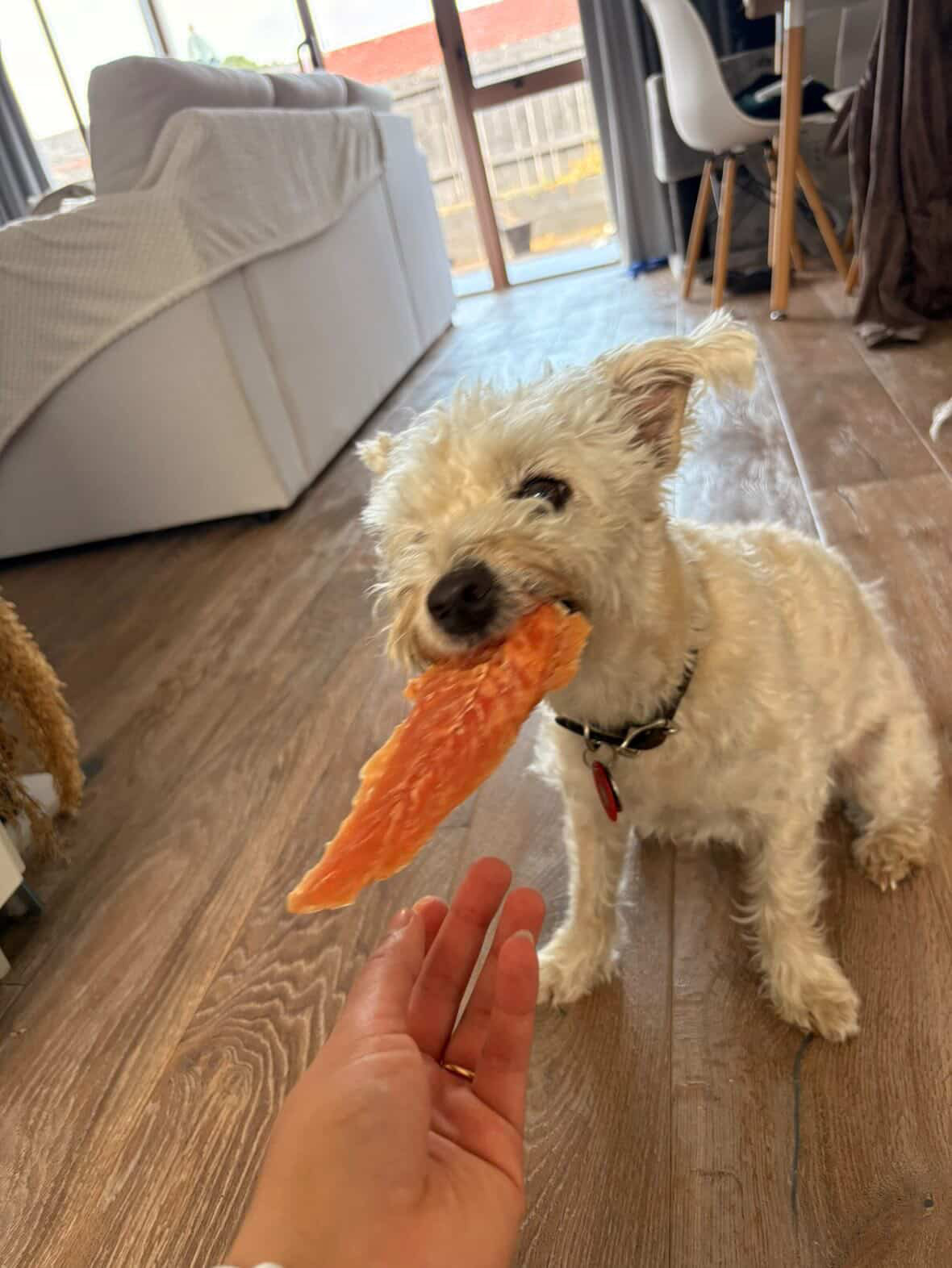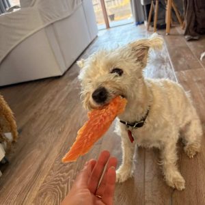 These Yours Droolly Chicken Tenders are a high protein, low calorie treat for your best friend, and perfect for rewarding or training.